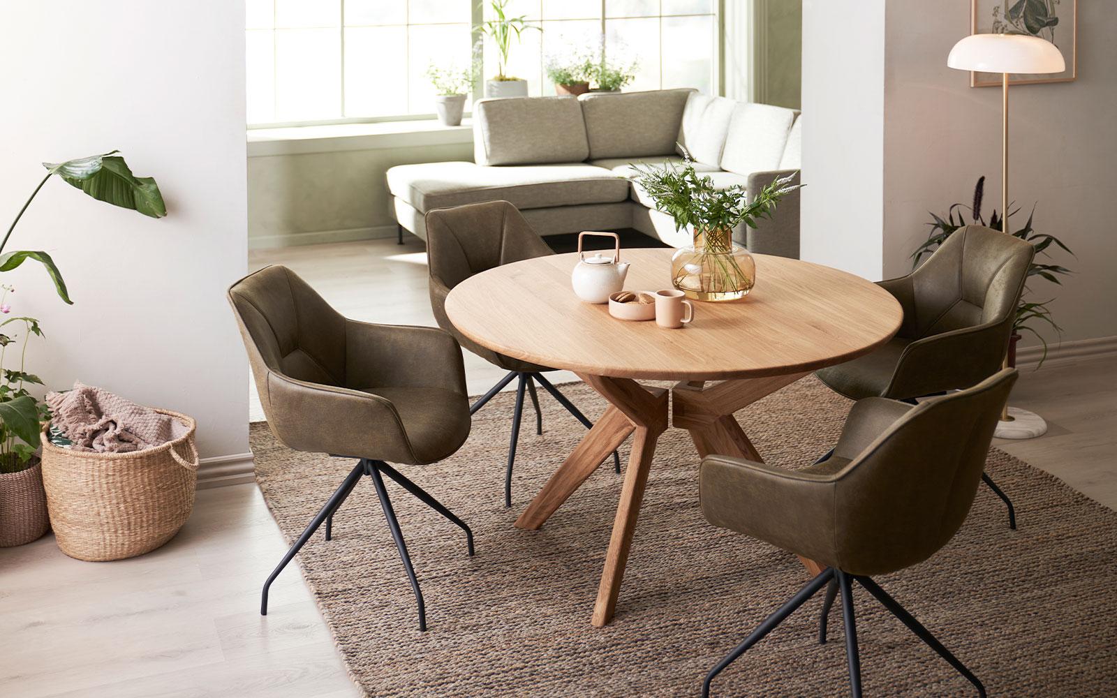 Stella spisebordet i massiv eg er et godt valg, som skaber fundamentet for at kunne lege med farver og materialer rundt om det fine runde bord.